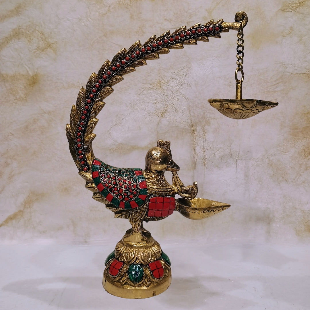 This exquisite brass diya showcases two beautifully crafted peacocks with intricate detailing and vibrant stone embellishments. The gracefully curved arch holds a suspended diya, adding a royal touch to your home decor. The combination of brass and colorful stonework makes it a unique and elegant piece for any pooja space.