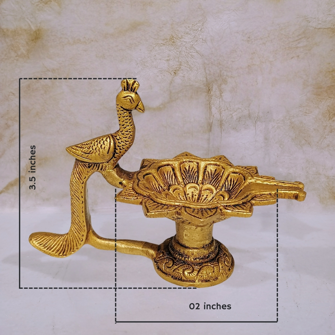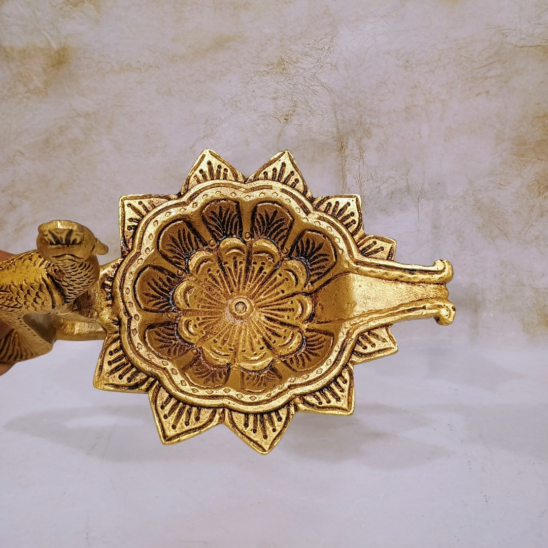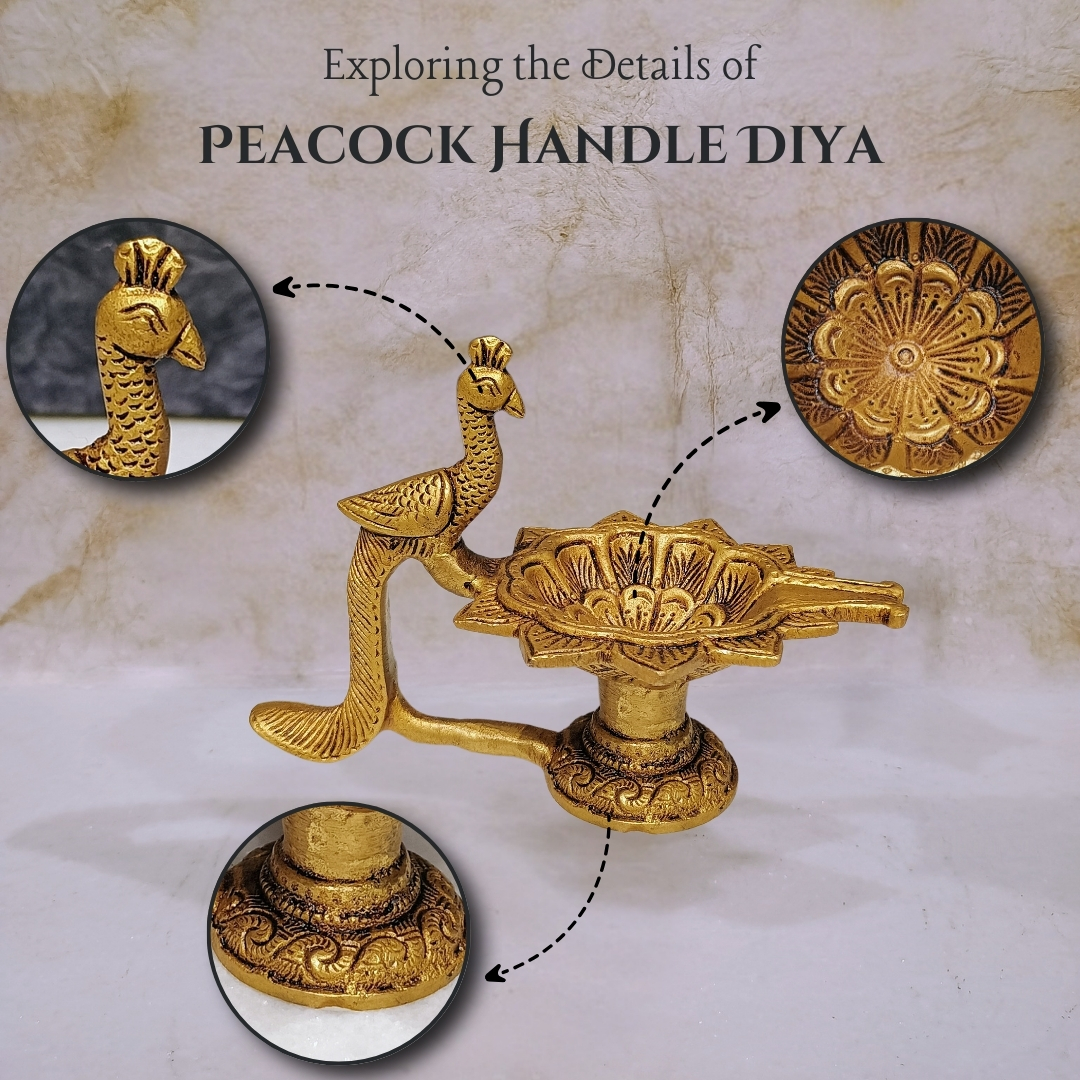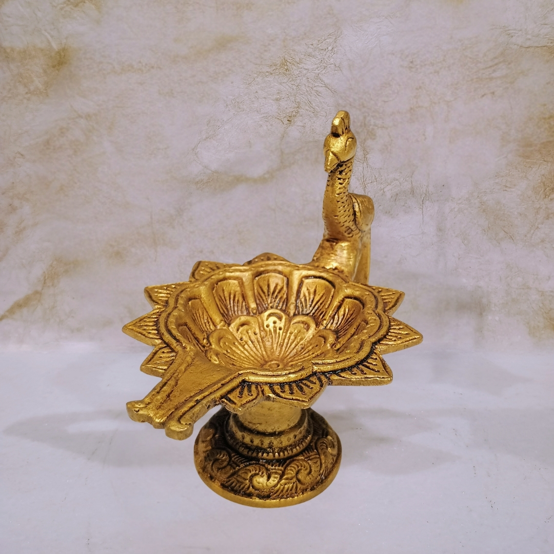 This elegant brass diya is designed with a stunning peacock handle, symbolizing beauty, grace, and spirituality. The lamp itself is shaped like a blooming lotus, representing purity and devotion, making it a perfect addition to any sacred space. The antique gold finish enhances its traditional charm, making it a timeless decor piece.